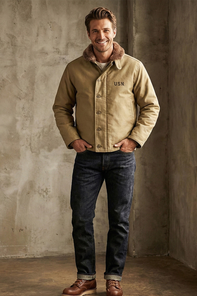 N-1デッキジャケットは、1940〜50年代のアメリカ海軍において、甲板作業員のために開発された防寒用ジャケットです。潮風、強風、氷点下という過酷な環境下で任務にあたる兵士を守るため、装飾性よりも実用性を最優先して設計さ…